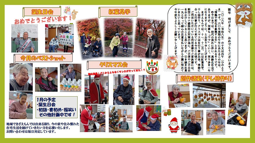 きざえもんでは、11、12月、には紅葉見学、干し柿作り、クリスマス会を行う事が出来、季節に合った行事が行えて来ている今日この頃です。