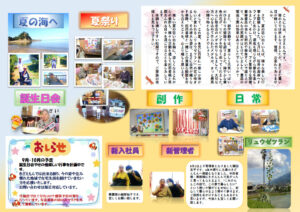 お知らせ きざえもんだより きざえもん新聞 介護 2025.09.22 きざえもん新聞107号 🍉きざえもんだより🍉 こんにちは!小規模多機能型居宅介護きざえもんです😊3年振りの久々更新となりました💦申し訳ありません😵今後は、2ヶ月に1度のペースで更新して参りたいと思います😊まだまだ暑い日が続いておりますが皆様、体調お変わりありませんか?7月・8月は、海へドライブに出かけたり、この夏、氷見に百年に1度しか咲かないと言われる「リュウゼツラン」の花が咲き、ご利用者様と一緒にドライブがてら見に行かれたり、プチ夏祭りを開催しました🍉プチ夏祭りでは射的や金魚すくいが毎年恒例で盛り上がりました😊創作活動では、ひまわりの壁飾り作りや敬老会のメダル作りも行いました🏅花が好きというご利用者様と一緒にダイキまで出掛け、お好きな花の苗を選んで頂き、きざえもんで一緒にお世話をして下さっています🌸ご利用者様の希望や要望に少しでも応えられる「きざえもん」でありたいと思います😊次回は、敬老会の様子等をお伝え出来ればと思います😊中々、涼しくなりませんが皆様お体ご自愛下さい😸 ダウンロード きざえもん新聞107号(PDF)
