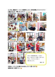 お知らせ きざえもんだより 介護 2026.01.28 きざえもん11・12月 こんにちは!小規模多機能型居宅介護きざえもんです。皆様、体調お変わりありませんか?11月は、干し柿づくり、西山興隆寺へドライブなどお楽しみいただきました🥰12月は、職員がハーモニカ演奏をしたり、利用者様とクリスマスツリーの飾り付けを一緒に行いました🐰 今年もご利用者様が楽しく元気で過ごして頂けるよう支援して参ります。今年も、きざえもんを宜しくお願い致します。 ダウンロード きざえもんブログ(PDF)