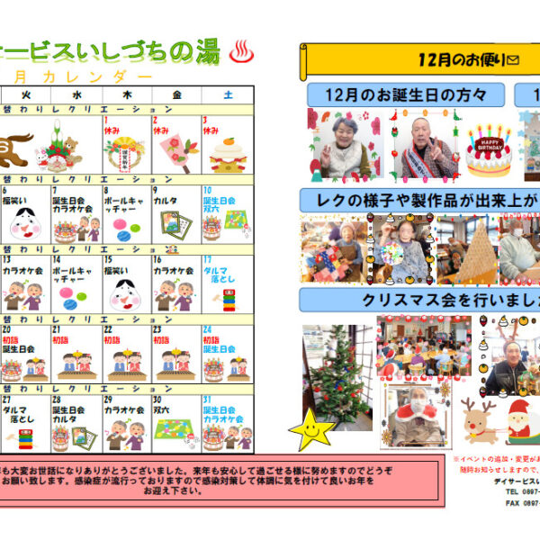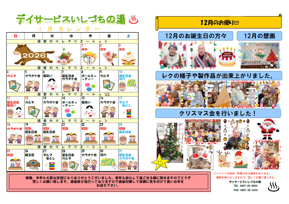 お知らせ 介護 熟年コミュニティせとうち 2025.12.26 熟年コミュニティせとうち 10~12月 こんにちは、熟年コミュニティせとうちです。 一年は早いもので本年も残りわずかとなりました。師走の気忙しい日々の中、皆様いかがお過ごしでしょうか。 今年は暖冬といわれ安心していると急に冷え込み、日々の気温差で衣類の調整に悩ましい冬になっています。県下ではインフルエンザ流行で、入居者様やご家族様には大変申し訳ありませんがやむを得ず面会制限を行っています。年末年始久しぶりにご家族様と会えることを楽しみに計画立てていらした方もいらしたのではないでしょうか。スタッフ一同一日も早く落ち着くことを願い皆様が健康で、安心した生活が続きますよう努めています。 それでは10月から12月の様子をご覧ください。 10月 ほくしんコティ保育園運動会 リハーサル風景を見せてもらいました。 泣いても笑っても何をしてても可愛い♬ 地方祭では妙口地区の獅子舞が来訪 勇壮な舞でたくさんのパワーをもらいました 11月 気候の良い日はお散歩 秋の花々を見て移り行く季節を感じました 12月 クリスマス会 リーダーたちがハンドベルの演奏で盛り上げました 緊張の中、入居者様の優しいまなざしがありがたく、感謝です💦 来る年は午年、馬のように「前進」 一歩一歩を大切にしながら挑戦する気持ちを持ち続け、確実に前へ駆け抜けていきたいと思っています。皆さまにおきましても明るく希望ある素敵な一年でありますよう心よりお祈りいたします。これからも熟年コミュニティせとうちをよろしくお願いいたします。