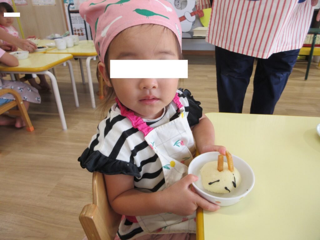 蒸しパンに顔を描いて、耳をつけました👍